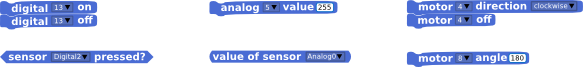 Los objetos Arduino proporcionan bloques para las funcionalidades básicas del micro-controlador, escrituras y lecturas digitales y analógicas, y otras funcionalidades de más alto nivel. También encontraréis bloques para tratar con motores estándar y servomotores de rotación contínua.